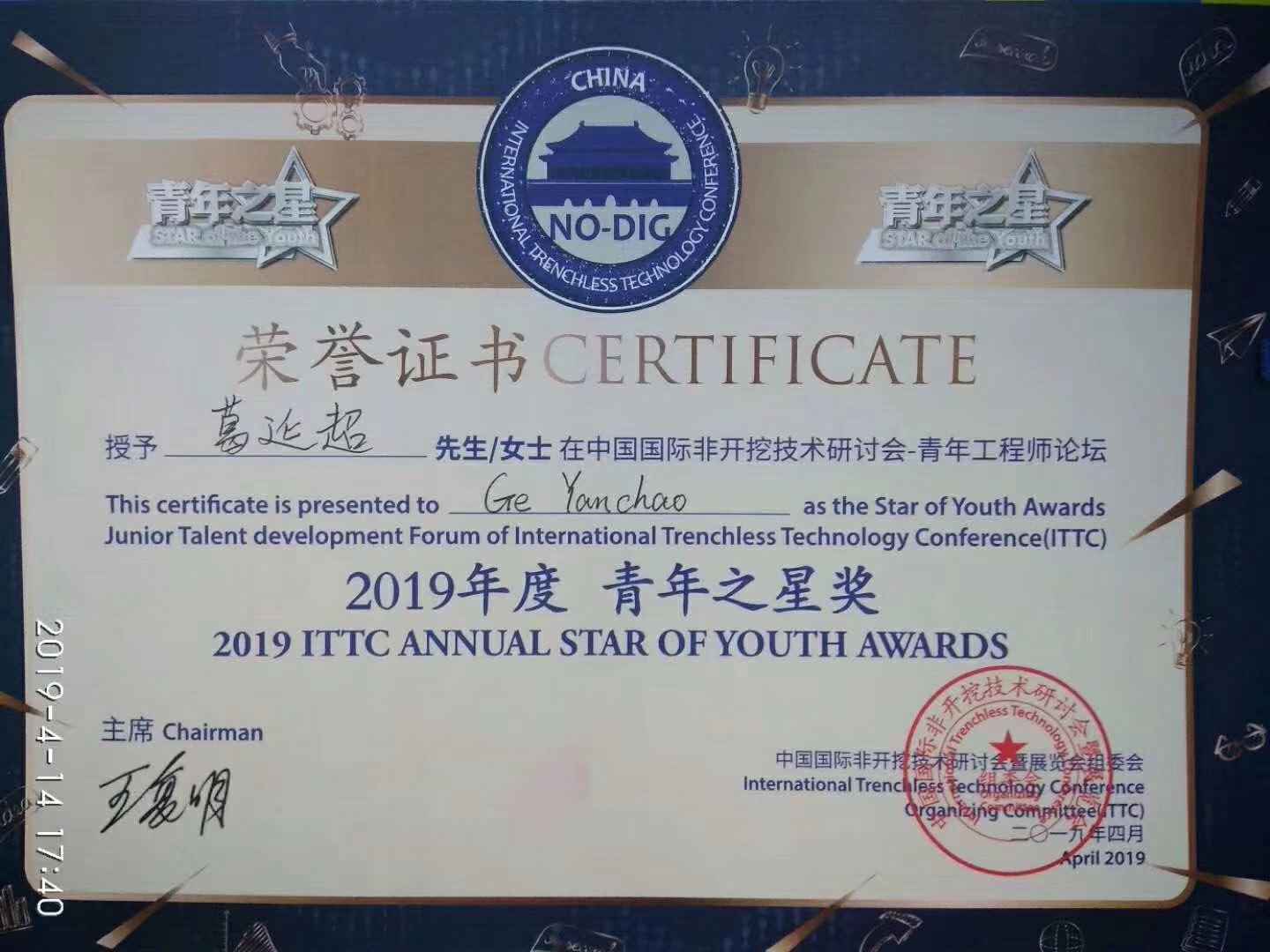 祝賀我公司總工程師葛延超先生獲得中國(guó)非開(kāi)挖協(xié)會(huì)唯一的青年之星稱(chēng)號(hào)!